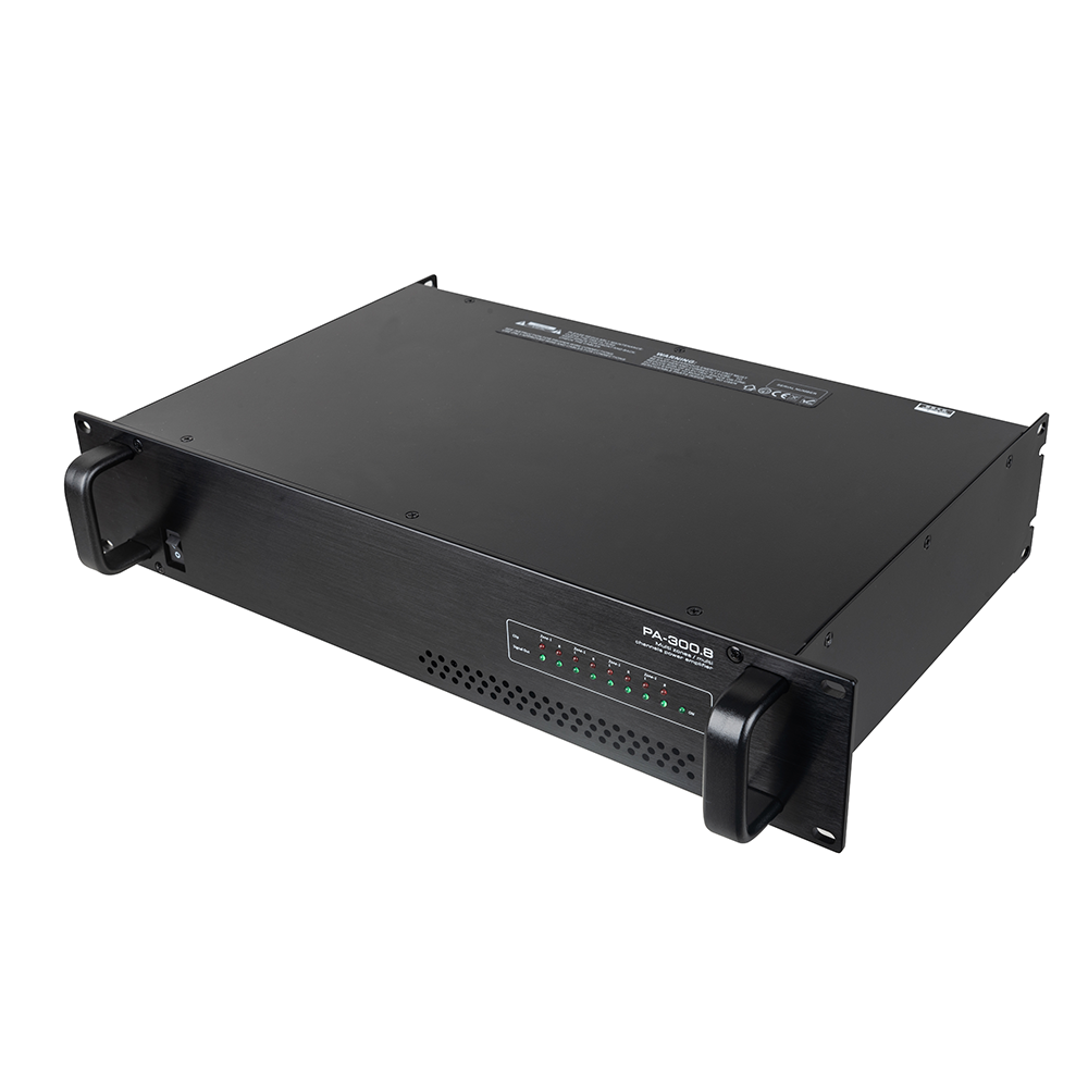The PA-300.8 sets a new standard in multi-zone amplification, delivering eight channels of pristine 300W power in a compact 2U design. Engineered specifically for commercial audio distribution and public address systems, this professional amplifier features Phoenix connector outputs for secure, reliable installation in fixed audio applications. With exceptional audio quality and robust protection systems, the PA-300.8 is the ideal solution for sophisticated audio distribution networks requiring multiple independent channels.